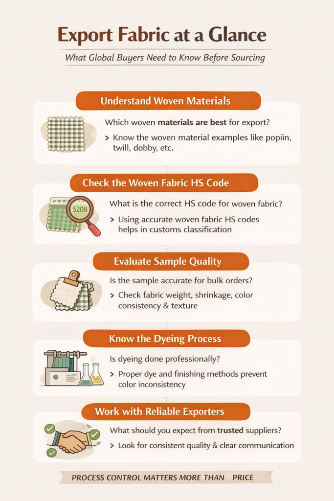 Export fabric sourcing is not just about choosing a material and placing an order. Buyers need to understand fabric construction, sampling, HS codes, and supplier reliability. Whether sourcing from hubs like Erode or working with exporters, the real difference comes from process control and consistency, not just price.