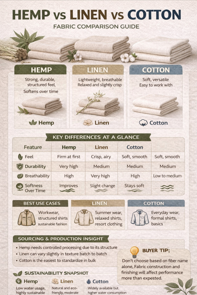 Hemp, linen, and cotton are all natural fabrics, but they behave very differently. Cotton is softer and more versatile, linen is breathable and relaxed, while hemp is stronger and more durable. The right choice depends on the garment, not just the fiber.