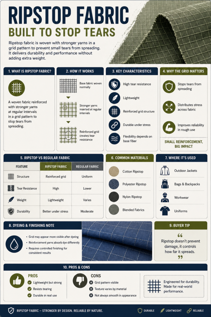 Ripstop is not a fiber, and it’s not limited to one type of fabric. It’s a construction method. You can find it in cotton, polyester, nylon, and various blends, and each one behaves differently.