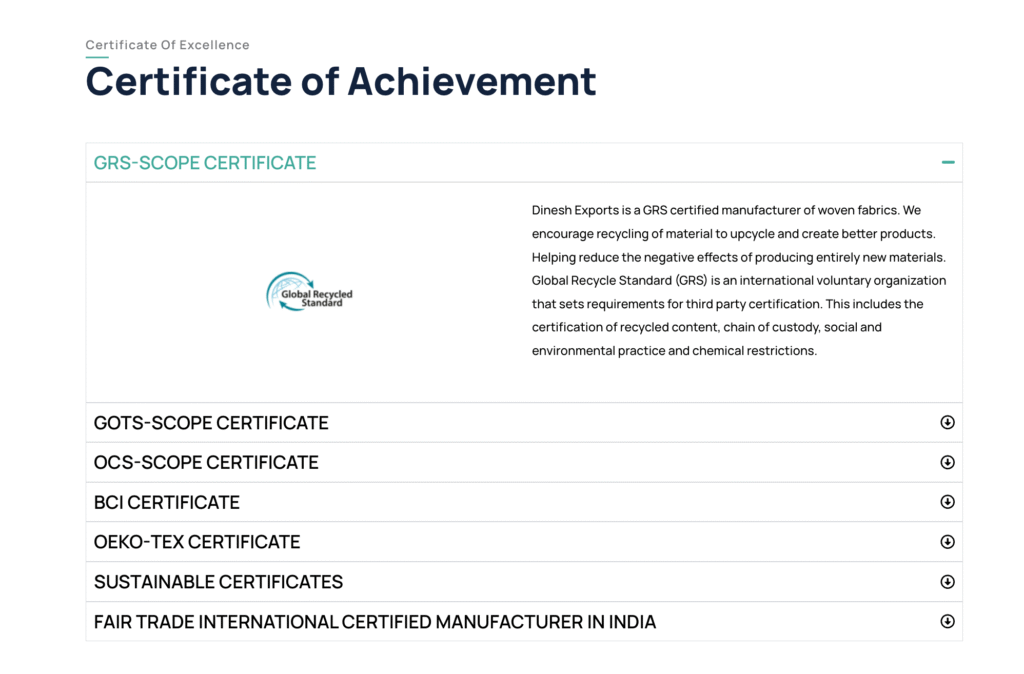 We follow strict quality checks at every stage, from yarn procurement to weaving, dyeing, and finishing. Our fabrics are tested for parameters like shrinkage, colorfastness, tensile strength, and pilling resistance. For sustainable fabrics, we also provide certifications such as GOTS, OCS, and OEKO-TEX to support traceability.
